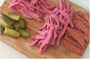 Rindfleisch, Wasser, Salz, Gewürze, Antioxidationsmittel (Ascorbinsäure)